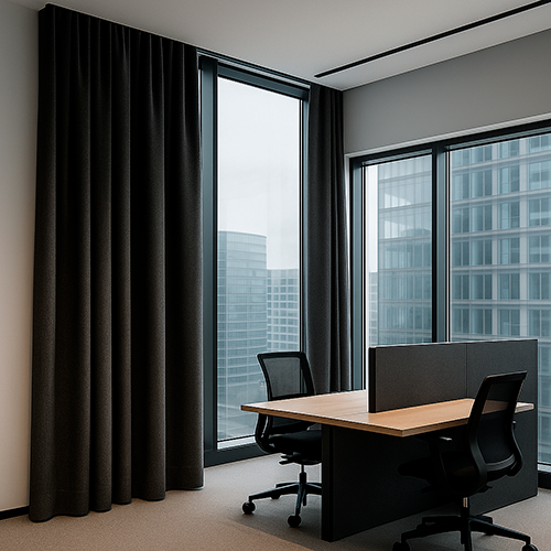 Акустические шторы MUTE ACOUSTIX — это функциональное решение для снижения эха, улучшения разборчивости речи и создания комфортной акустики в помещениях с большими стеклянными поверхностями.